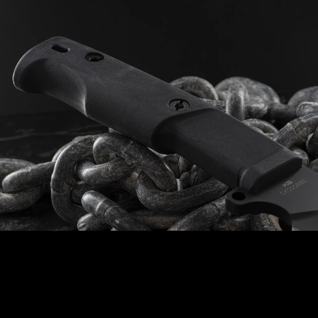 Extrema Ratio has developed this tool by blending ancient and modern design concepts. The KS Machete employs combination grinds. The razor-like hollow grind closer to the grip yields a fine, sharp edge without compromising the overall thickness of the back of the blade (which needs to be extremly strong).