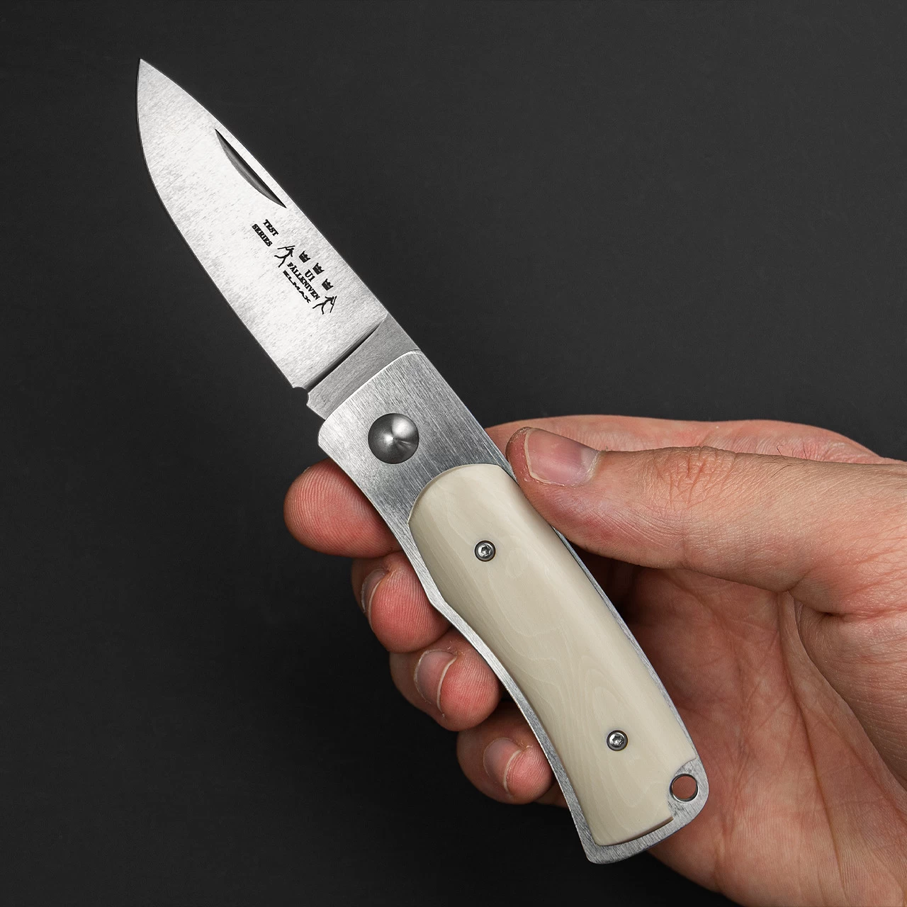 The handle is made up with stainless liners and stunning Elforyn (imitation ivory) scales.