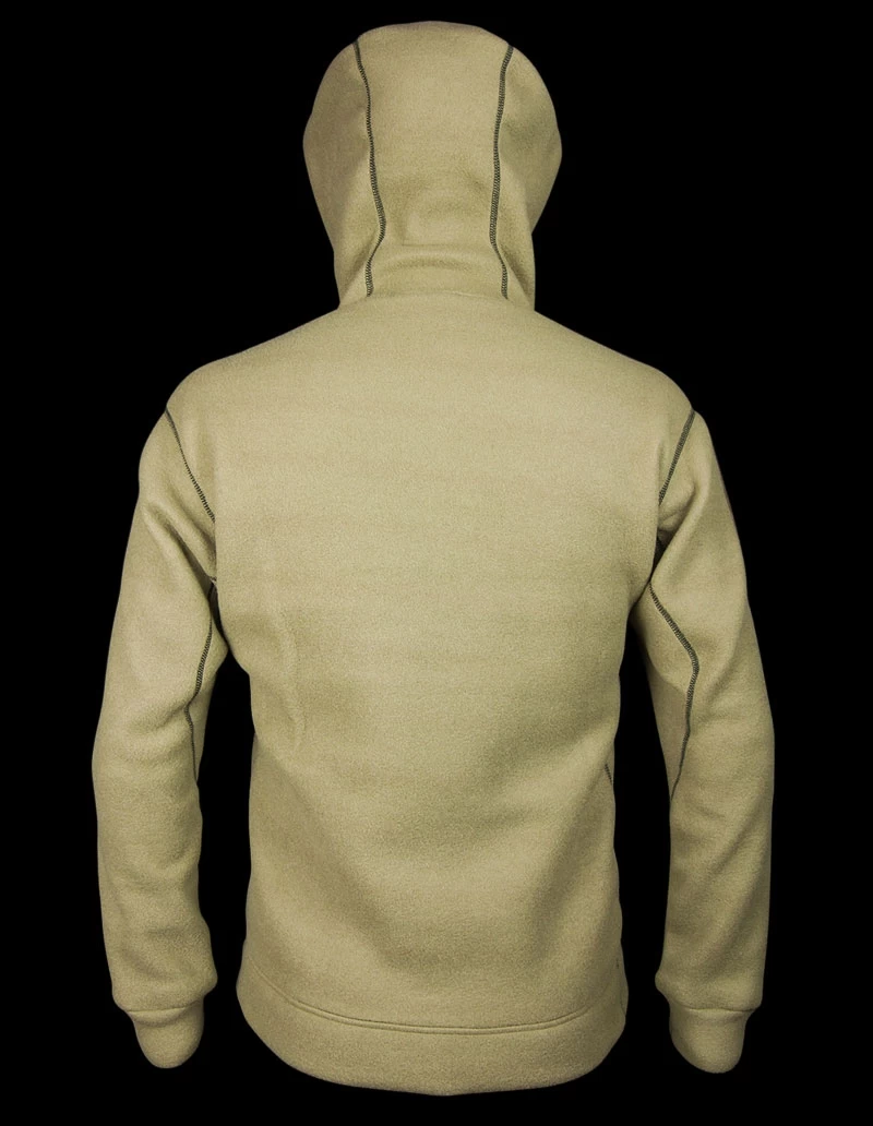 The American made Kitanica Rampart is a fire retardant hoodie constructed using a 200 gram Nomex Fleece and sewn with Nomex thread. Favoured by construction, petrochemical and refinery workers Nomex is fire retardent and will stand up to repeated washing far better than standard materials. The Multicam aramid brim around the inside of the hood helps to keep the shape of the hood and protect your face from high winds.