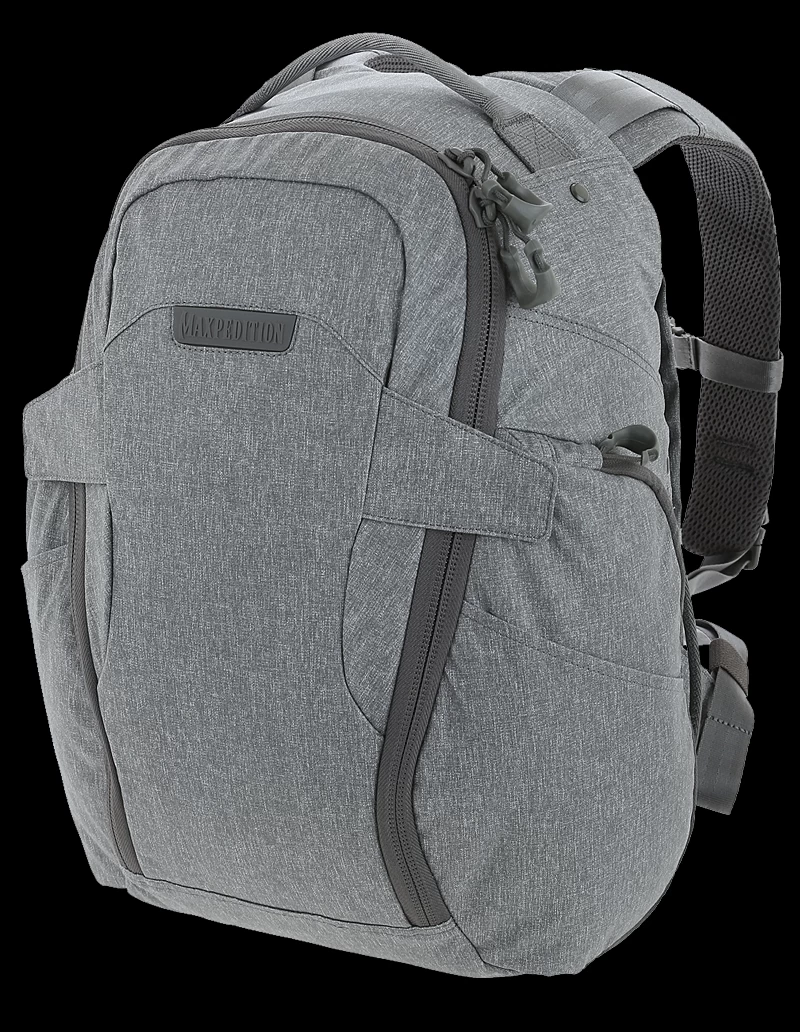 The Maxpedition Entity 21 is an ergonomic everyday carry pack with padded shoulder straps and quick release buckles. The main compartment has drawbridge straps for additional security, and there is a dedicated sleeve sized to fit most tablets. The front exterior has tuckable magnetic wings for quick temporary closing of the main compartment. The dual access rear compartment is fully loop-lined, and a double-sided hook Security Lockout Strip is included. Dual side ports are perfect for headphones, charger cables, etc.