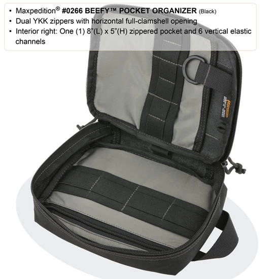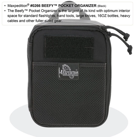 Maxpedition beefed up the FATTY POCKET ORGANIZER for increased capacity. The Beefy Pocket Organizer is the largest of its kind with optimum interior space for standard flashlights, hand tools, large knives, 16OZ bottles, heavy cables and other fuller-sized gear. A full clamshell opening reveals a hefty main compartment, containing 15 elastic dividers and 2 large slip & zippered pockets. This portable utility carry is perfect for big jobs and can be dropped into your Maxpedition bag or attached to its exterior PALS webbing for extended travels.