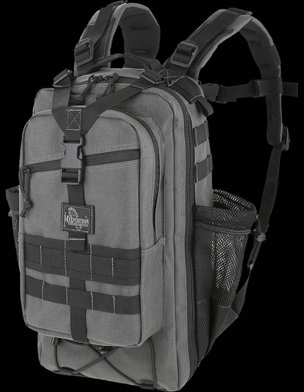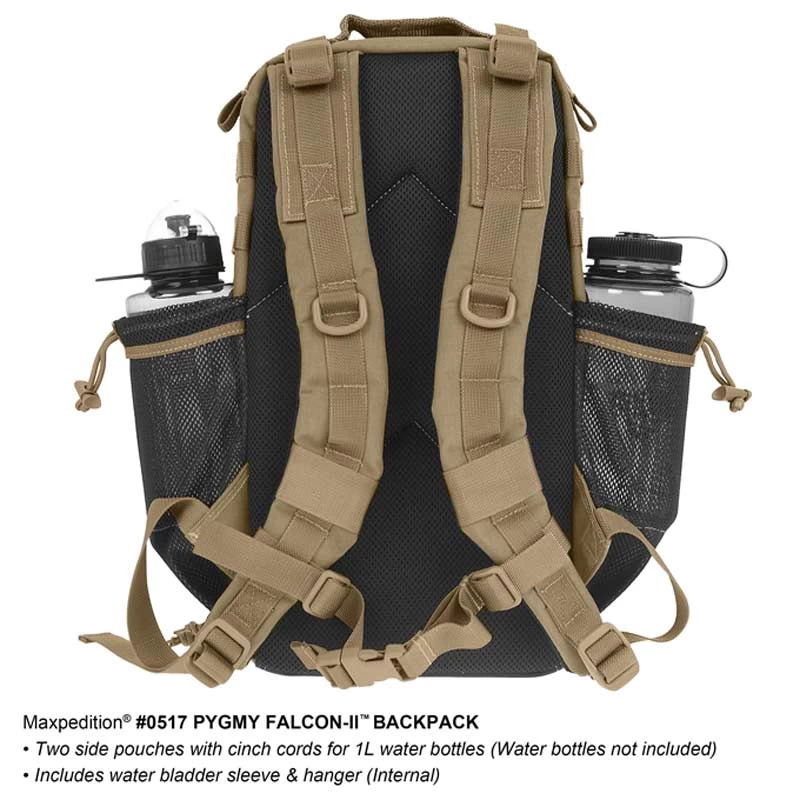 The Pygmy Falcon-II is a compact rectangular urban daypack with distinct military styling and 1400 cubic inches (23 liters) of carry capacity. The Y-shaped compression strap that MAXPEDITION is famous for contributes to the bag’s form and structural integrity while a row of sewn nylon hard points in front allows users to attach other MAXPEDITION pouches and accessories with the “snap and anchor” modular expansion system. Comfortable back padding and supple curvaceous straps supported by 1.25″ nylon webbing minimize the load on shoulders. Two side net pouches with cinch cord can be used to carry water bottles. Experience the workmanship, materials, design, and super durability for which MAXPEDITION is best known.