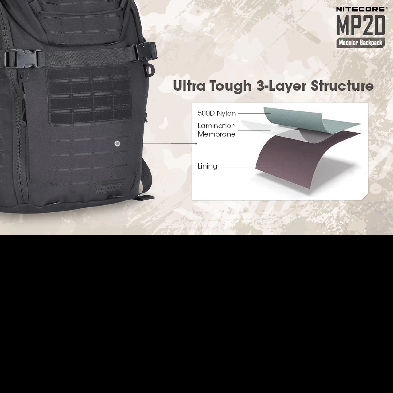 For ultimate durability and strength, the backpack has a 3 layer structure made up of a lining, a lamination membrane and waterproof 500D nylon. The MP20 has premium YKK zippers, UTX Duraflex buckles and breathable S-shape shoulde straps for ergonomic comfort.