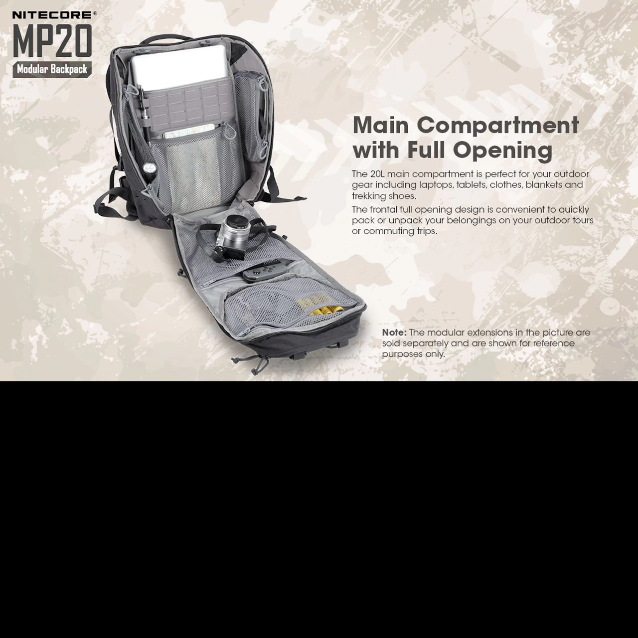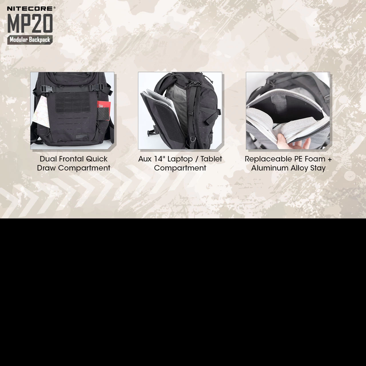 Featuring frontal and side cut Molle compatible strips, the MP20 can be added to at the various attachment points. The Nitecore NUP10 and NUP20 pouches are an ideal addition to the pack and can easily be attached to the front or side to increase storage space.
