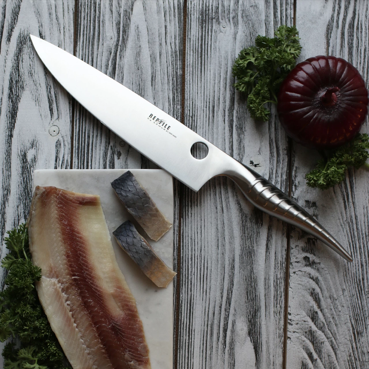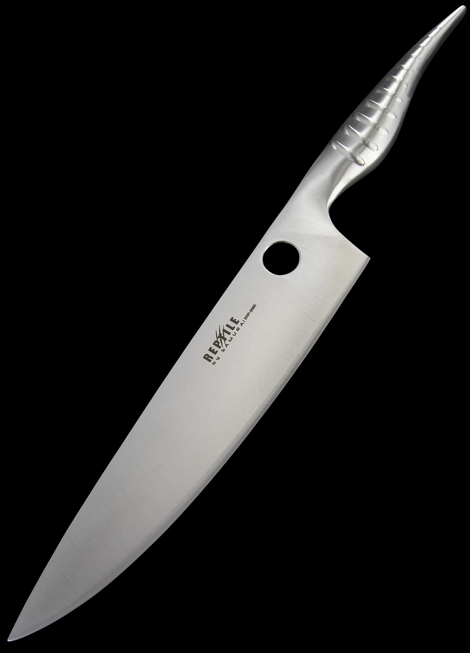 The Samura Chef’s Knife Reptile 20cm has a stainless “reptilian” decorated handle which will grace any kitchen both professional or domestic. Among the most versatile of knives, this is the one you’ll use every day for a wide range of operations, such as chopping, slicing, shredding, dicing and mincing. The steel hardness of 61 HRC makes it possible to deal with even the tenderest material easily.