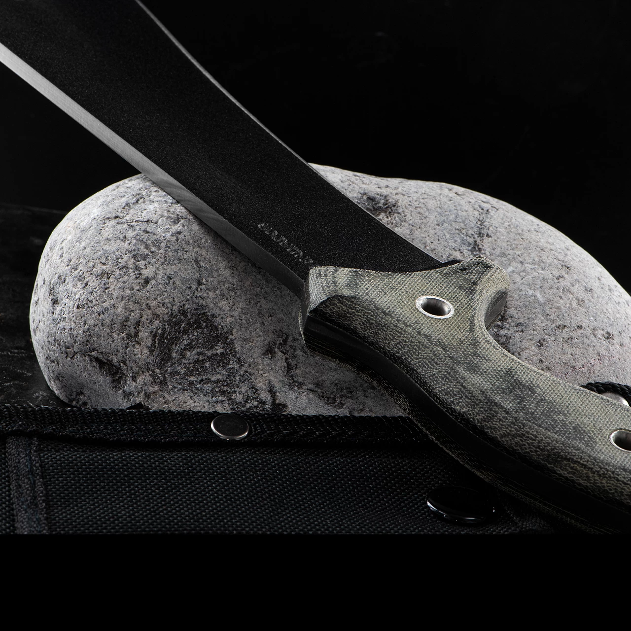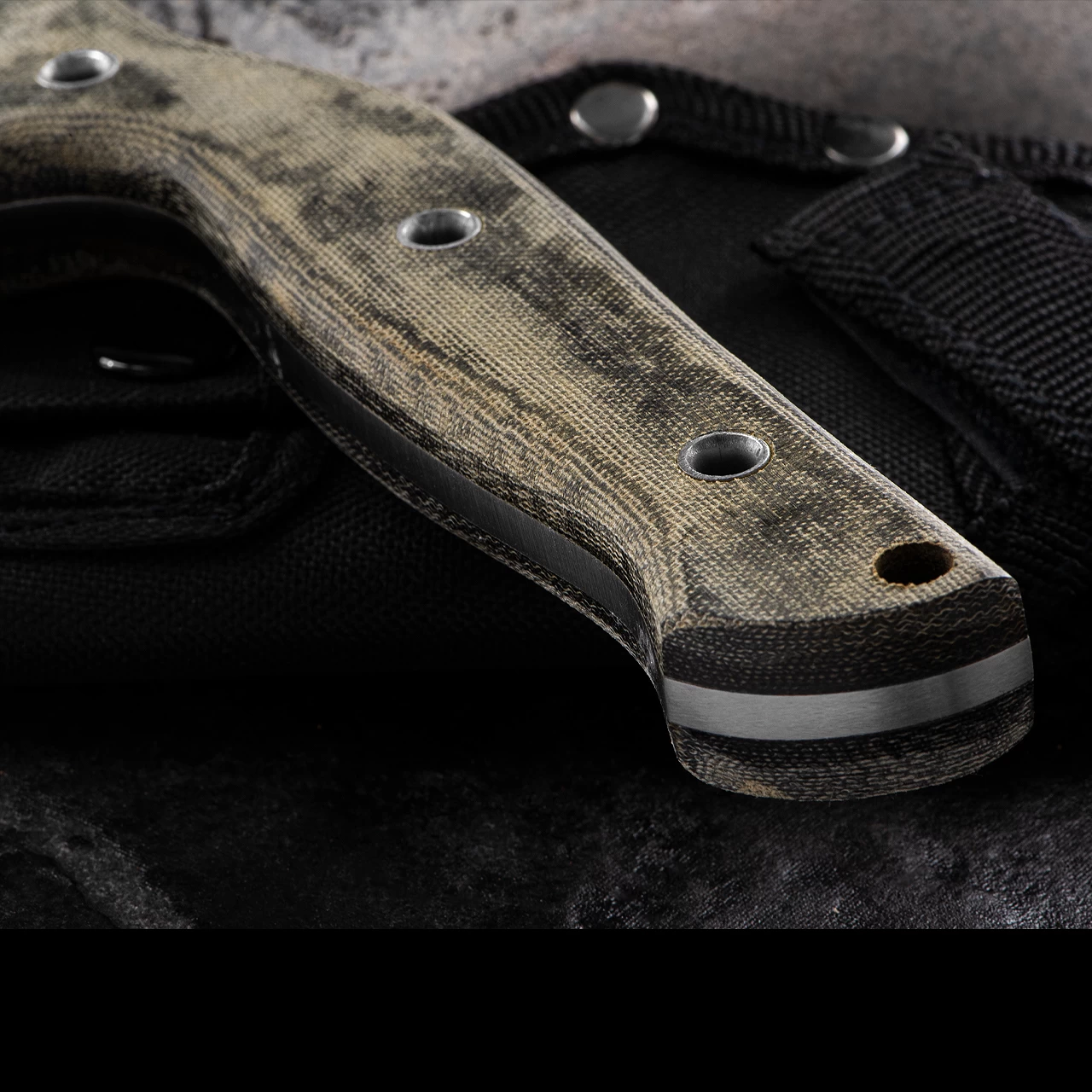 It has black Micarta handle scales with steel tube rivets and is exetremely comfortable in the hand and very nicely balanced. The recurved blade is 1075 steel with a black traction coating. It is supplied with a nylon sheath.