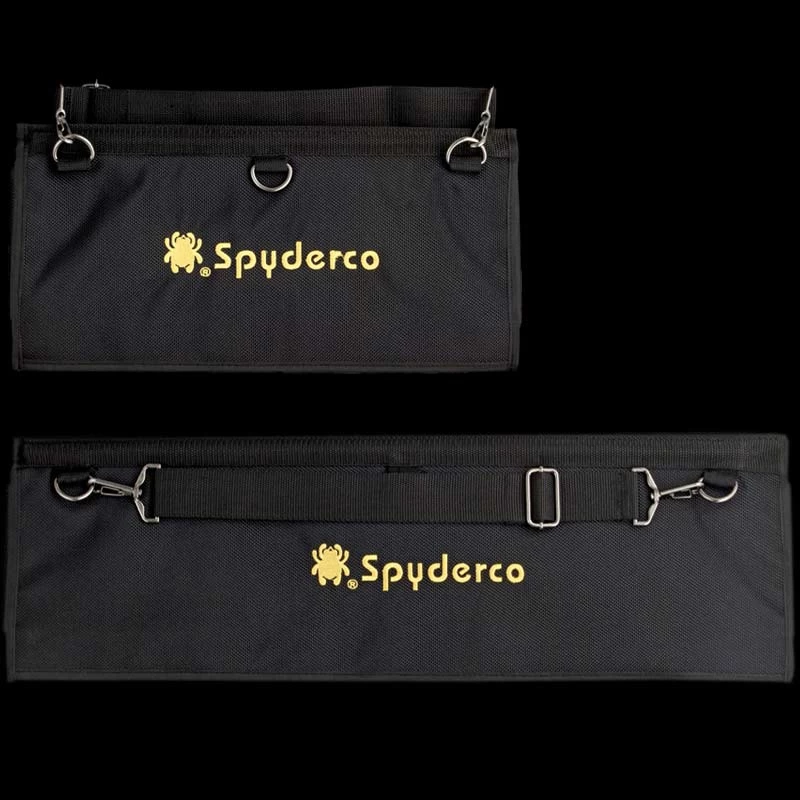 Constructed from heavy-denier polyester Cordura, the Spyderco SpyderPacis available in two sizes Small (18 pockets) and Large (30 pockets). Each pocket is fronted with a clear plastic window for viewing knives tucked inside. It tri-folds over and seals closed by way of a Velcro strip running the width of the pack. The knives remain secure and separated in their pockets and cannot rub or scratch against each other. An adjustable length shoulder strap attaches with two durable steel D-rings letting you hang the pack for display on a wall or sling it over your shoulder to take with you. Spyderco’s name and bug logo are embroidered in gold thread on the closing flap.