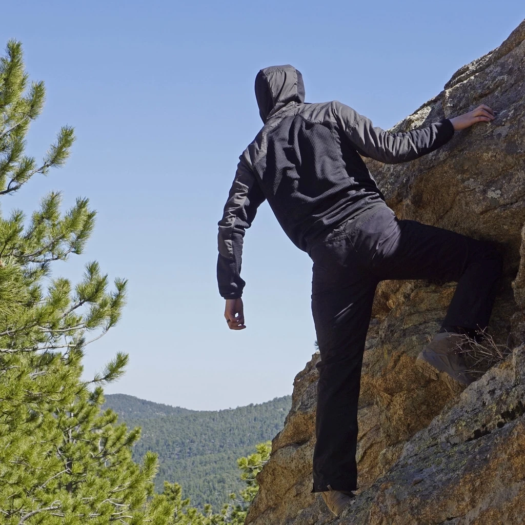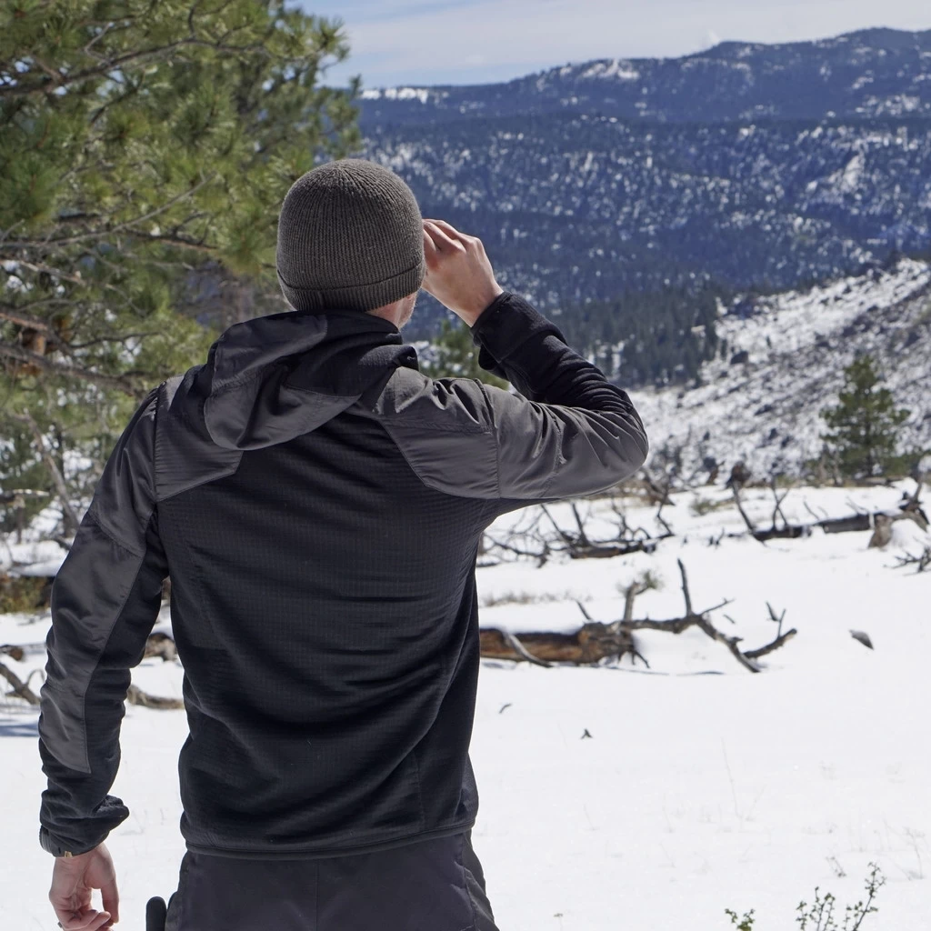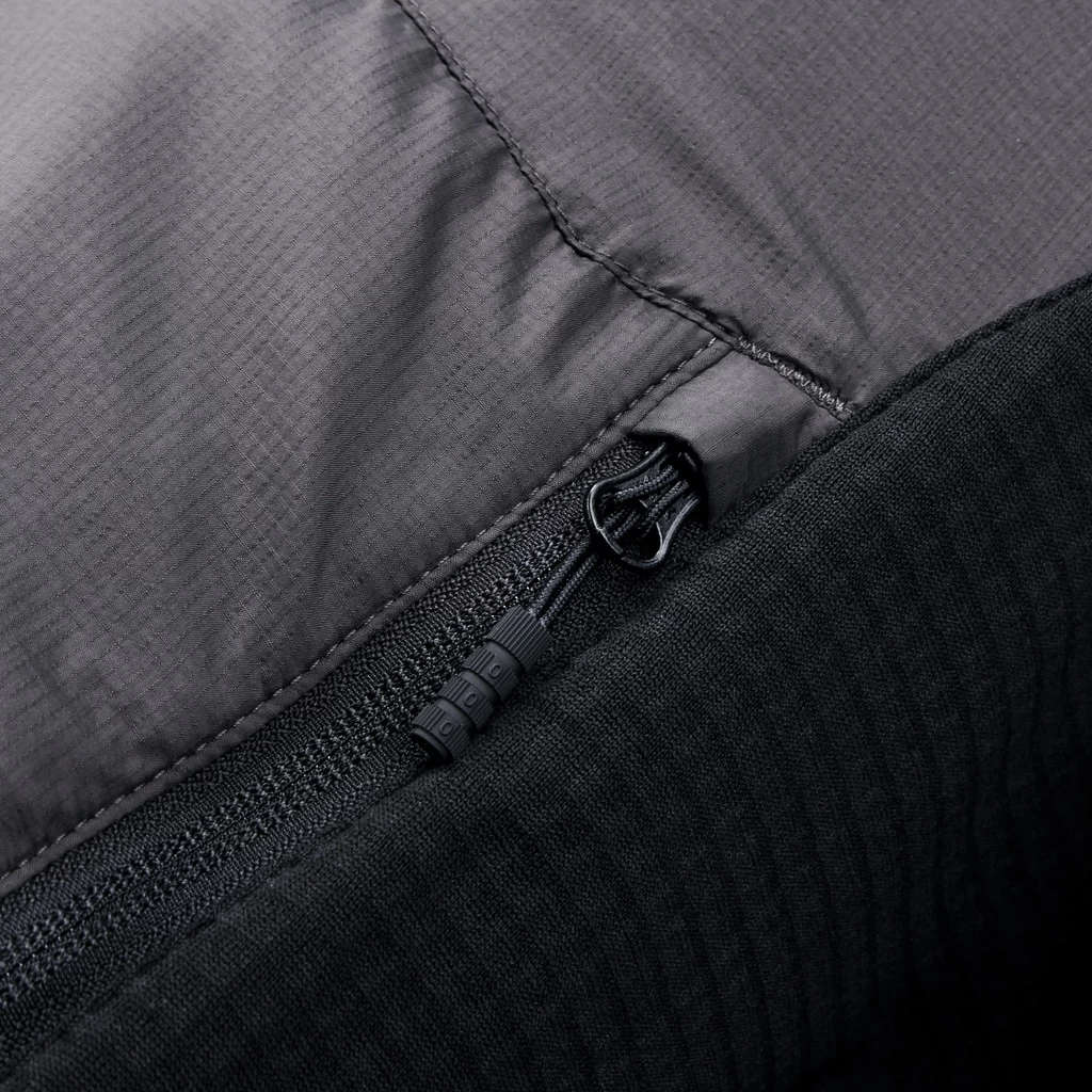 Strategic insulation in the torso, shoulders, bicep, and hood minimizes core heat loss, while a synthetic grid along the back and arms provides maximum breathability and wicking performance, even under a pack. This symbiotic combination of materials balances heat loss through convection, while strategically preventing over-heating during exertion under load.