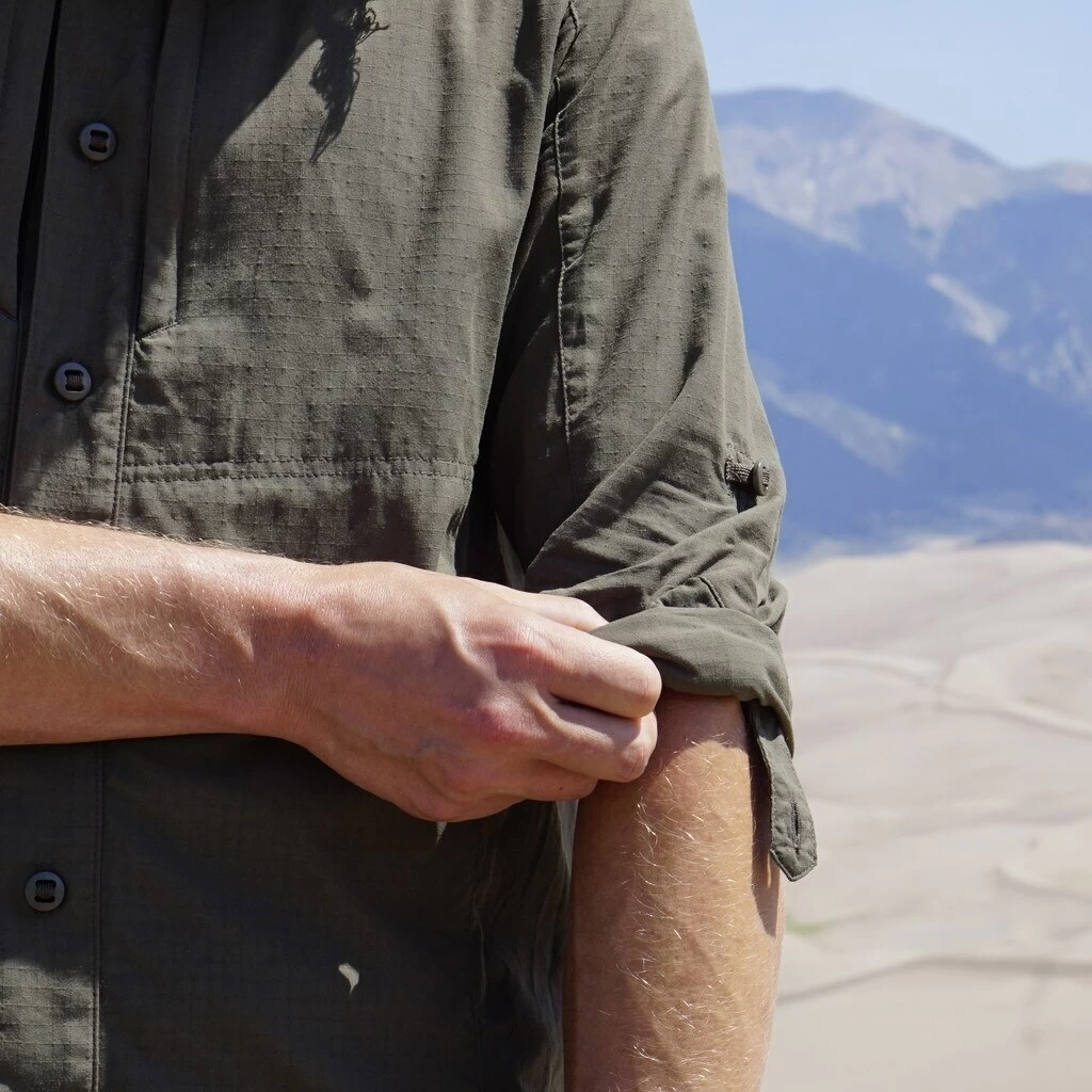 Dual secure chest pockets keep travel documents, spare cash, or other small items close at hand. Sleeves roll-up and secure with a button flap, allowing you to get your hands dirty. UPF 50 sun protection and underarm mesh panels help you keep your cool under pressure.