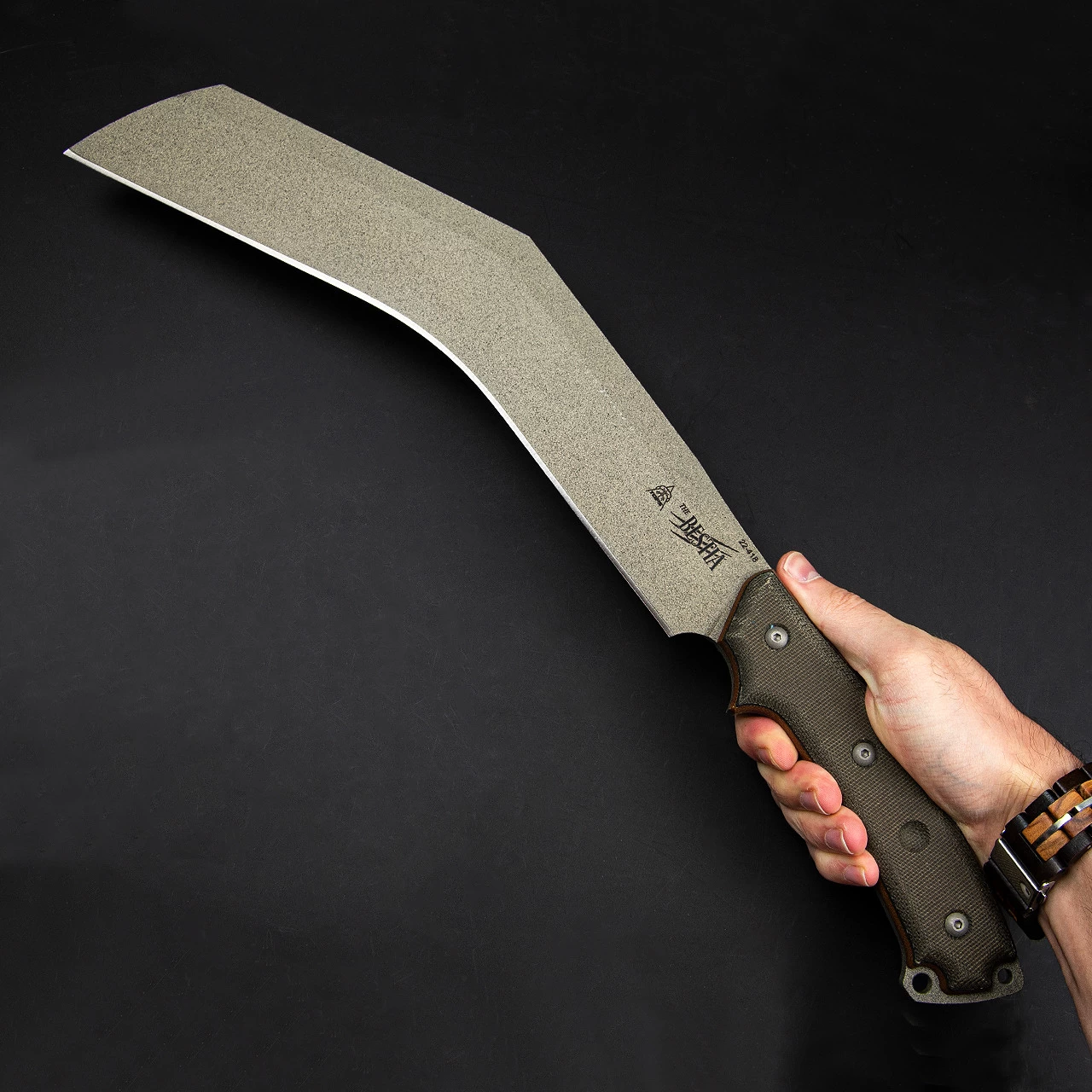 Designer Leo Espinoza wanted a large kukuri-like chopper, but not an actual kukuri. So, The TOPS Bestia was born by melding the TOPS El Chete – already one of TOPS’ most popular workhorses – with a kukri, to create a true workhorse in chopping ability. The long, forward curved blade and weight behind it bites deep with each swing and the tan traction powder coating will protect the blade for years to come. The handle is also long enough to hold in two positions. One for full on chopping and one for more controlled and even fine cuts. What really makes this knife comfortable to wield are the sandwiched Micarta handles that are thick, but well-contoured. The open-backed Kydex sheath with a leather dangler attachment make it easy to carry given its size.